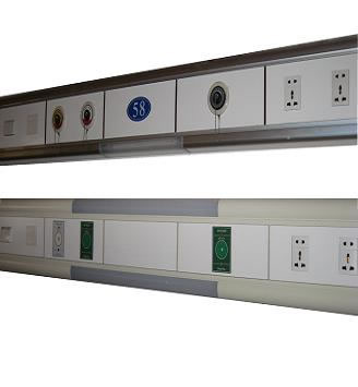 4,可根据工程需要,设置中心供氧及负压吸引等气体出口,也可配置空气等出口,也可配置空气等出口 可选配照明灯(每个床头上配置一只,系philips日光灯系列),照明灯长度180mm 每段上标配一只电源插座和一只开关,若还需要其它电气设备(如音视频插孔等)。